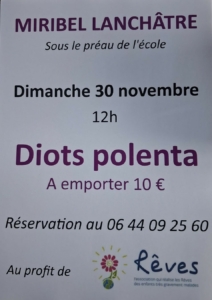 L’association rêves dont le but est d’organiser les rêves des enfants gravement malades organise le 30 novembre un repas diots polenta sur place ou a emporter sous le préau de l’école.